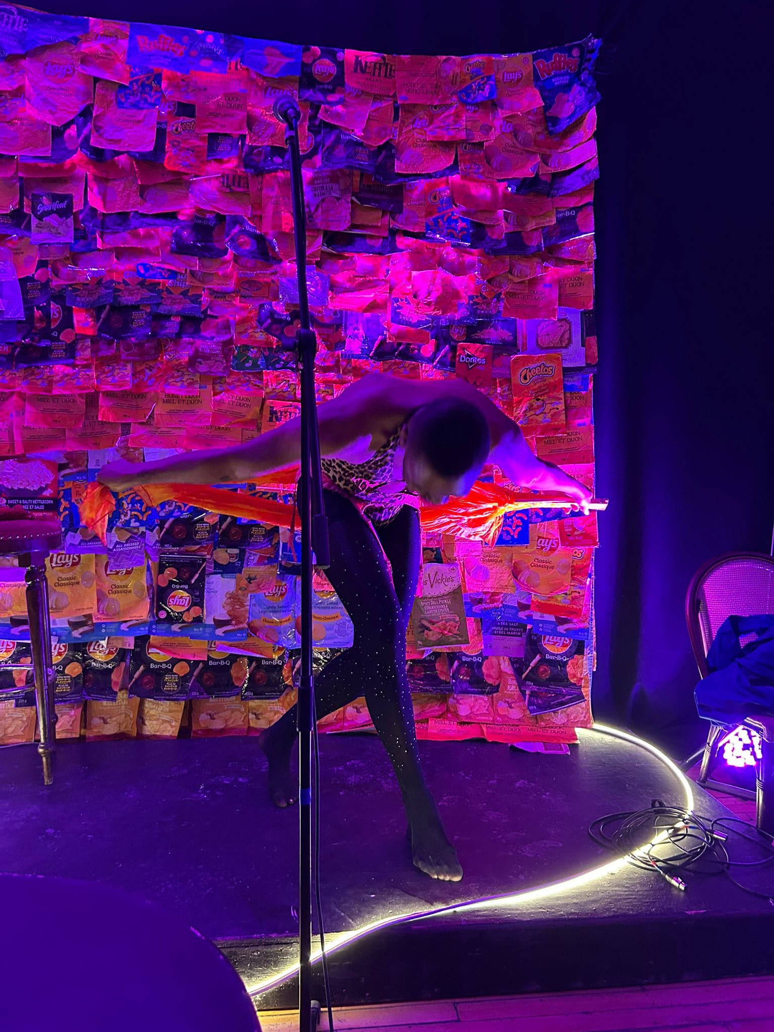 ON THE LEFT: Micha checks to ensure that the chip bags are connected to their satisfaction, and that the ‘quilt’ bares no significant flaws before installation, a testament to their attention to detail with this set piece. ON THE RIGHT: The stage, lighting and set at Maison France-Montreal lent itself to Micha’s performance. Here she adds the finishing touches, some notes that an audience member can assist her with the performance.