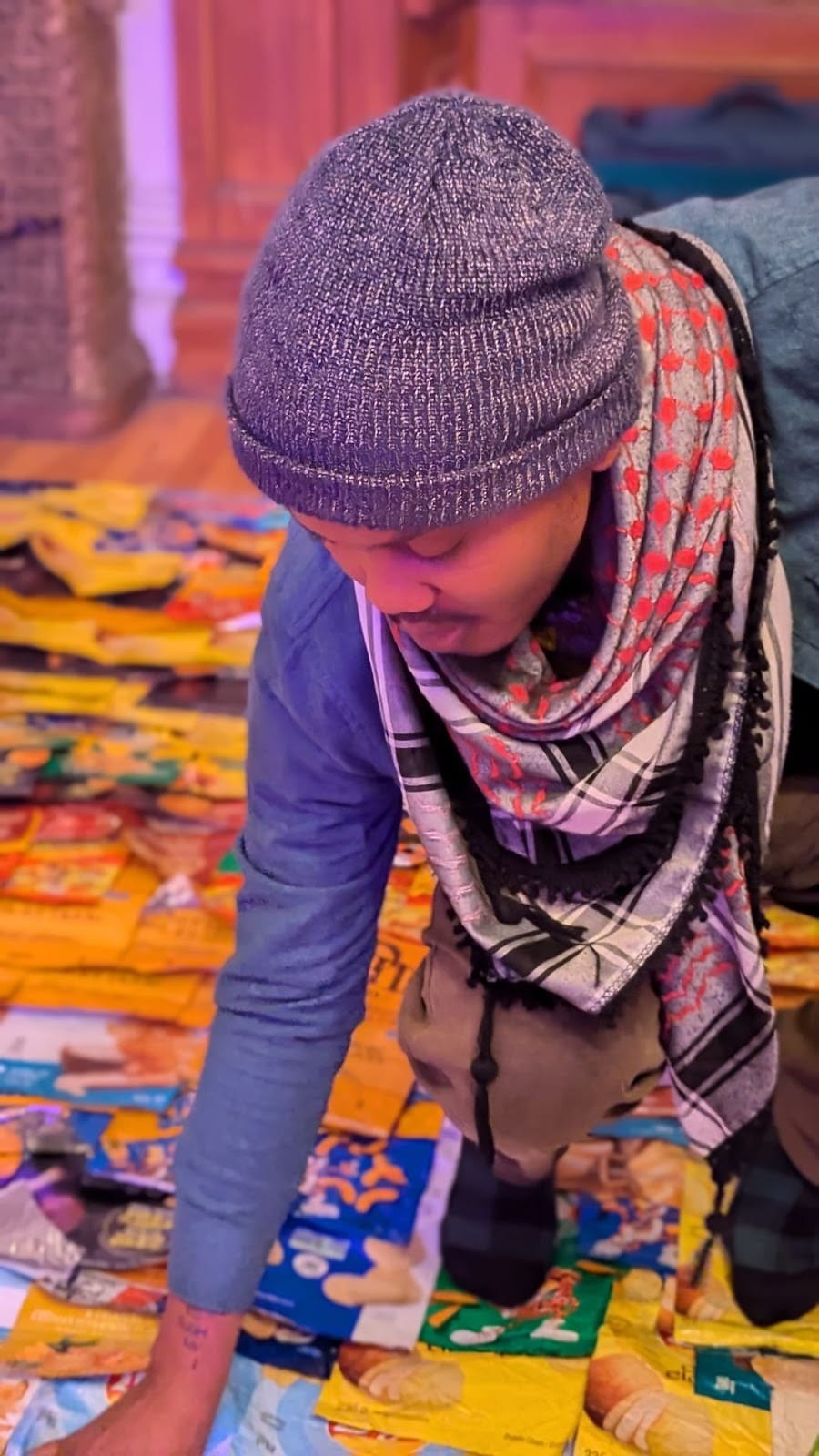 As the evening drew to a close, the quilt of chip bags still shimmered behind Micha like a patchwork constellation.