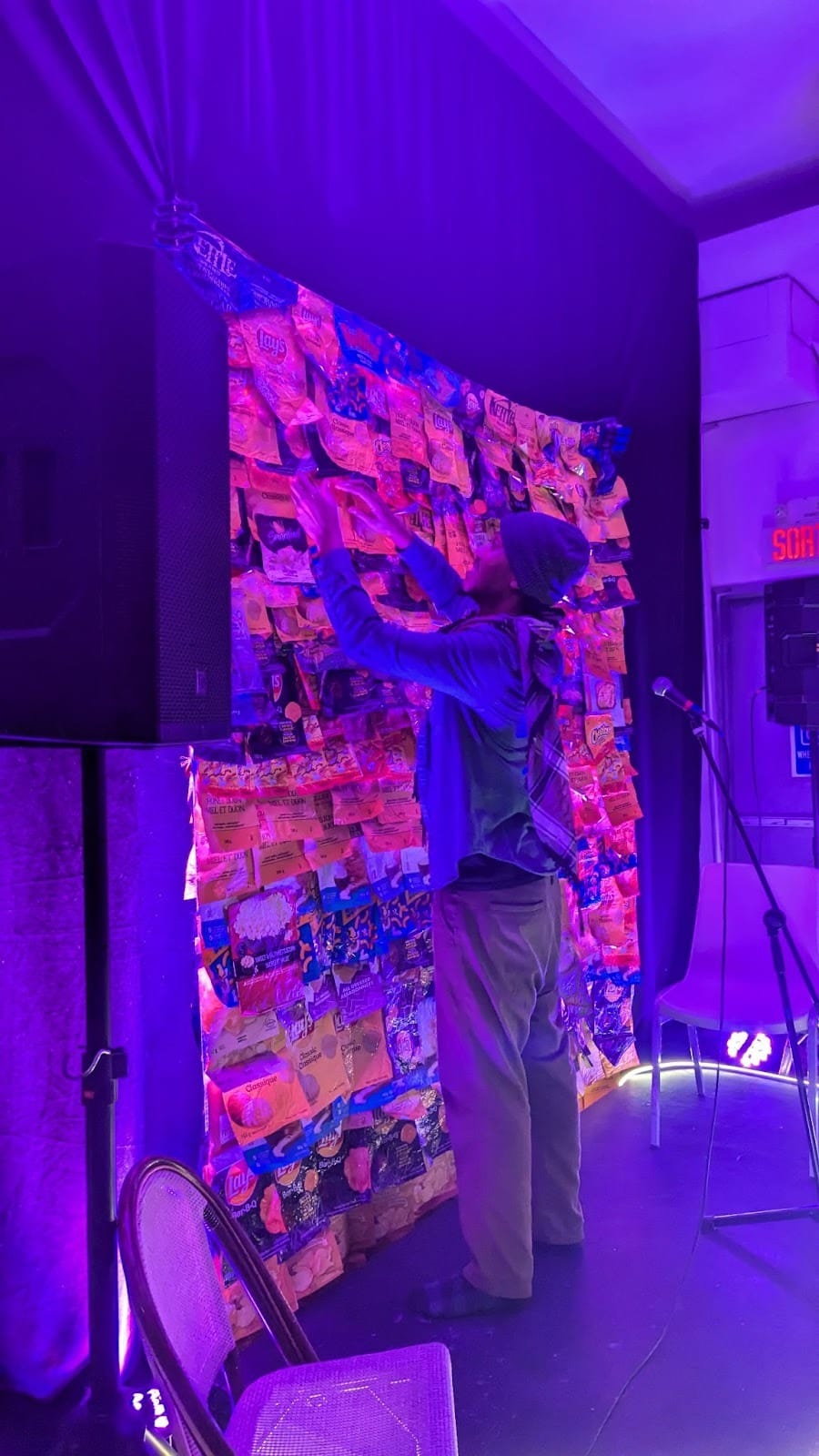 And the backdrop that Micha set up? That was their set. An audience member was asked to come onstage and pick a piece of paper from among many in the backdrop—a “quilt” of various chip bags—that would dictate Micha’s performance.