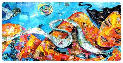 She now designs murals encompassing soulful figures textured with colorful and lyrical stories, using fragments to create the features of the figures and natural forms. Her models and collaging is unique in style and highlights the beauty and rawness that life has to offer.